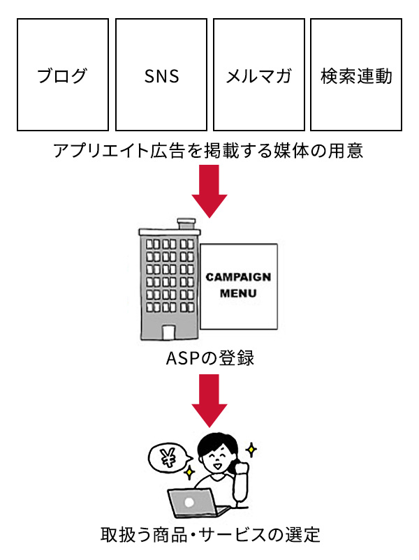 アフィリエイトは、運営の仕組みやポイントさえ押さえておけば初心者でも利益化が目指せる業種です。まずは、アフィリエイト広告を掲載する媒体を用意し、ASPに登録後、取扱う商品やサービスを選びましょう。