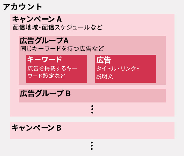 そして、広告グループでは、どのキーワードに対して、どの広告を表示させるか決定できる「キーワード」と、キーワードを検索して到達したターゲットに対して実際に表示させる広告文を管理する「広告」をセットで管理します。